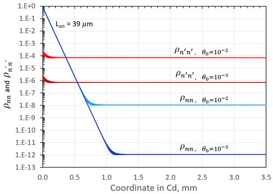 This case also can be calculated with the evolution Equation (16) and with the Hamiltonian in Equation (4). We show the results of such calculations as the values of and in Figure 2 for a BC 32 mm absorber and in Figure 3 for a Cd 3.5 mm absorber. For both figures, we calculate the density matrix components at the exit of the absorber as a function of for two values of 0.01 and 0.001.