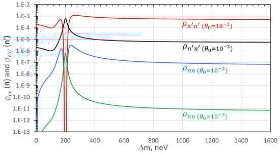 We assume that there is a small mass splitting between ordinary and mirror neutrons, . For the sake of definiteness, we take neV, the values suggested in Ref. [51] for solving the neutron lifetime problem. The identical real contributions in and are irrelevant for the evolution of the system, and we can omit them. In particular, for cold neutrons, km/s or so, the difference of the kinetic energies is negligibly small since . We also assume that contributions of mirror matter and mirror magnetic fields are negligible, and set and to zero. In this case, it is convenient to take the spin quantization axis as the direction of the magnetic field . Therefore, the magnetic field contribution for two polarization states will be . In addition, the last term in Equation (3) is the neutron decay width, which should be practically the same for the mirror neutron. Since the neutron decay time, s, is very large as compared to the cold neutron observation time, typically s, we can neglect this term in Equation (3).