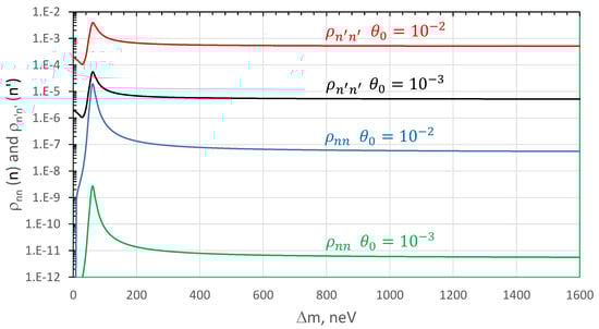 If , then for an arbitrarily small , the frequency will be large enough such that a neutron in the Lab with a velocity ∼1000 m/s will have an oscillation length smaller than 1 mm. If the size of the experiment is much larger than 1 mm, then the time-dependent probabilities of Equation (22) can be replaced by time-averaged values. Thus, we come to the time-averaged density matrix (TADM). In the TADM, the oscillation phases induced by variable initial phases and velocities of the beam neutrons will be averaged in the following way (we also use here the smallness of the angle ):