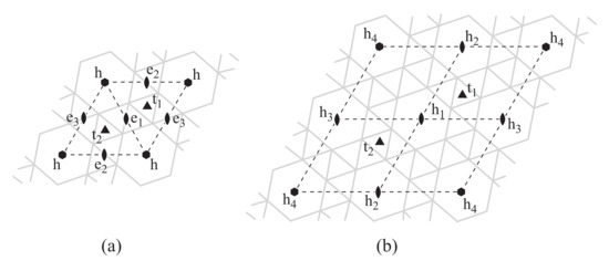 Calculations of the mobility representation using Equation (3) are now shown for the eight single-linked Archimedean tilings. In each case, the calculation is carried out for a array of copies of the basic unit cell indicated in Figure 1. The steps in the calculation are shown in Table 2, Table 3, Table 4, Table 5, Table 6, Table 7, Table 8 and Table 9 for each of the single-link Archimedean tilings. For an explicit example of how characters are calculated, consider Table 2 for tiling . The rhomboidal unit cell, shown below in Figure 2a, contains in total one hexagon and eight triangles. At each corner of the cell, a axis (and hence also and axes) passes through the centre of the unique hexagon h; a axis passes through the centres of triangles and in the interior of the cell, and a two-fold axis passes through edge midpoints , at the centre of the cell, and , at the centres of the cell edges.