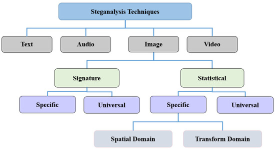 Figure 2 depicts a general taxonomy of steganalysis techniques, which is separated under multimedia data types and domains. Steganalysis approaches are classified into two kinds, signature and statistical steganalysis, according to steganalysis detection methods in the literature review. Statistical steganalysis is the process of seeking to find such statistical traces. When compared with signature steganalysis, statistical steganalysis is a more powerful tool since mathematical procedures are more sensitive than visual perception [1,2].