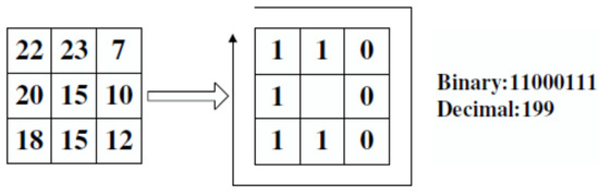 When x is less than zero, the function s(x) equals 1; otherwise, it equals 0. In the example shown in Figure 3, the central pixel value is 15, and the pixels in the 8 nearby pixels that are not less than 15 represent 1 in the associated LBP, while the others indicate 0. As a result, the LBP received is 11000111, with a decimal value of 199.