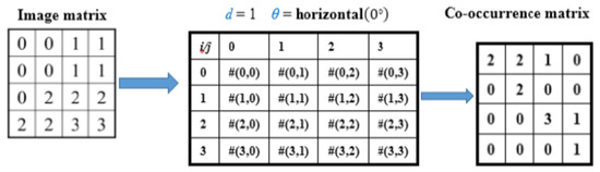 Gray-level co-occurrence matrix (GLCM) is a powerful second-order statistical approach for analyzing texture. For each image, GLCM is the matrix containing information about the relationship between values of an adjacent pixel [18,19]. Texture descriptors, or GLCM descriptors, are common texture features used to extract texture information. The GLCM [20] features are dependent on statistical moments and are obtained from a co-occurrence matrix. Figure 4 shows an example of GLCM. In total, 14 textural characteristics were computed from using GLCM.