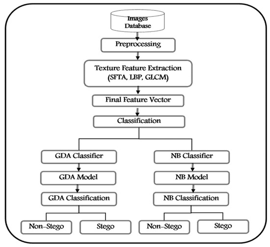 Classification is a fundamental stage that involves extracting image features from an original image (non-stego image) and its stego counterpart. The aim would be to discern the difference between non-stego or stego-image. As a result, in this paper, the GDA and naive Bayes (NB) classifiers were employed to identify whether the image is non-stego or stego, as shown in Figure 5. The classifiers were fed the feature vector derived from the SFTA, LBP, and GLCM features. In the training phase, the two classifiers were trained with various texture-related feature sets. The trained classifiers were used to identify a stego image from a non-stego image during the testing phase.