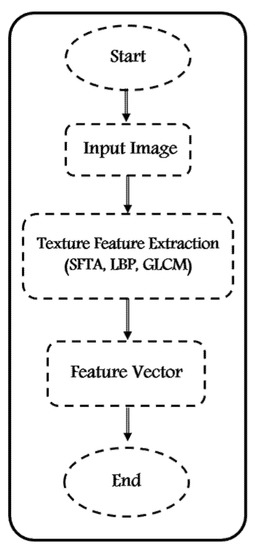One of the most common texture descriptors is segmentation-based fractal texture analysis (SFTA) [17]. The texture of an image is its most noticeable feature. The SFTA method has two major phases: (i) using the two-threshold binary decomposition (TTBD) method to decompose the input grayscale image as a set of binary images; (ii) for each binary image formed by subtracting the fractal dimension from the borders of its regions, SFTA feature vectors are computed. For more details, see [17]. The SFTA features are extracted using the given mathematical formula (Equation (2)).