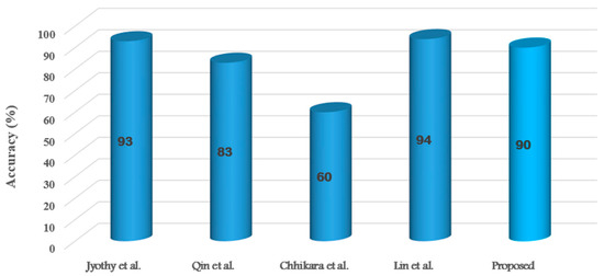 As demonstrated in Figure 9, the proposed feature extraction strategy has a better accuracy rate and fewer feature vector dimensions (21) than the majority of existing approaches, making it computationally easier. The methods [12,14] produced excellent results, with 416 and 1944 feature vector dimensions, respectively. However, the feature vector’s high dimension necessitates a significant amount of computation. Ultimately, the experiment results in Table 2 show that our method uses fewer features and improves image steganalysis classification accuracy.