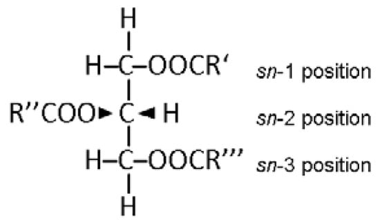 - Christie, W.W. Triacylglycerols 3. Regio- and Stereospecific Analysis of Triacyl-sn-glycerols. Available online: https://www.lipidmaps.org/resources/lipidweb/lipidweb_html/lipids/simple/tag3/index.htm (accessed on 10 March 2021).