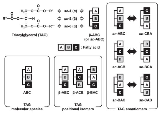 Triacylglycerols (TAGs further in the text), or triglycerides (as they were denoted previously), or triacyl-sn-glycerols (as they are denoted more correctly at present), consist of a glycerol moiety in which the three hydroxyl groups (-OH further in the text) are esterified with fatty acids (FAs). Triacylglycerols are the main and most abundant class of simple lipids, denoted as simple because they yield two types of primary products per molecule in hydrolysis: glycerol and fatty acids [1]. The need to know, in detail, the TAG molecular and intramolecular structures is determined by their specific role in the life of plants, animals and humans: (i) TAGs are the main component of natural oils and fats of plant and animal origin, including all edible oils [1]; (ii) TAGs are one of the main energy sources for living organisms [2]; (iii) TAGs are the most important source of FAs that are essential for human health [3]; (iv) the intramolecular structure of TAGs strongly influences both the digestibility and metabolism of dietary FAs [4]. On the other hand, the TAG composition of plants is impacted by cultivar, harvest period and geographical origin [5,6,7,8], while that of animals depends on feeding as well [9,10]. Thus, the detailed examination of the TAG molecular structure has always been one of the main tasks of lipid analysis. The problem that the analysis faces is that since natural TAGs are produced by enzymatic synthesis, a center of asymmetry exists at position 2 [11] (Figure 1), while, in addition, each of the three -OH groups might be esterified by a different FA. Indeed, in most fats and oils, FAs are usually limited to the 20 most abundant in nature (out of the approximately 1000 described as yet [11]), but even these are of different chain lengths, might have different numbers, positions and configurations of double bonds and may esterify any of the -OH groups, leading to the formation of a spectacular number of TAG species in many natural lipids (consider milk fat, fish oil, other marine organisms or bacteria, for example). Thus, depending on the FA structure and position on the glycerol backbone, the simple lipid class of TAGs presents a number of different structures, including regioisomers and/or enantiomers, creating a serious challenge for efforts aimed at determining their molecular and intramolecular structures.