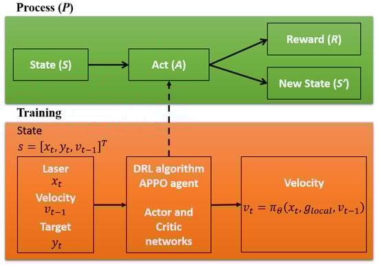 where is the observation from the laser scanner, is the local target calculated by the global planner, and is the velocity command from the last time step. The functionality of elements of methodology is shown in Figure 1. Here, is used to derive the relative local pose and the angle to path, which are concatenated in . The final state representation is .
