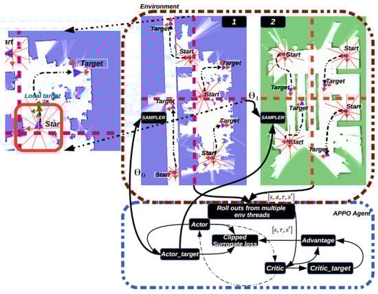 The method in this paper adapts the PPO method and modifies it into an asynchronous manner to solve the navigation task. The robot learning approach is shown in Figure 2. The approach is to have the robot learn the strategy in an asynchronous manner. The robot interacts with scenes in an asymmetric environment. Each scene that the robot learns is divided into 4 parts, each representing a specific start and goal. A dedicated worker is sent to collect a representation of the state in each puzzle. Once the robot learns the generalized strategy element in one scenario (i.e., scenario 1 in the upper left corner), it copies a set of initialization parameters to another scenario (i.e., scenario 2 in the upper right) and explores the effect of the parameters learned in scenario 1 on the success rate of the robot in scenario 2. A global PPO is created to interact with the scenes in the asymmetric environment. Each scene is divided into sub-scenes to provide a training environment for each worker. The worker is initialized with one patch of the scene, and it collects roll-outs from the environment. The environment, on the other hand, runs as a server to generate packets that wait for a worker to collect them. Unlike the normal environment, which purely reports the locomotion of the robot and controls its movements, the environment used here is essentially a navigation framework. It also provides a valid path from a global planner. The global planner used in this paper adapts the A* algorithm and runs a trajectory smoother afterward. It serves as a plug-in in the complete environment. By taking advantage of the global planner, the policy learned in this paper is a local planner in the navigation task. Once learned, the proposed method can be easily modified and adapted in the real environment and the navigation framework.