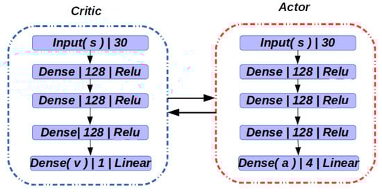 According to Algorithm 3, the critic network will firstly iterate and then iterate the actor network until the convergence of the algorithm is completed. The critic network implemented 3 dense layers with 128 hidden units in each layer. The actor network used a similar structure but gave 4 dimensions of outputs . Then, these outputs were plugged into a joint normal distribution to enable the robot to make decisions in a stochastic manner.