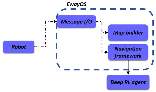 The training process of the model developed in this paper was implemented alongside a navigation framework developed by (http://www.ewaybot.cn/ewayos.html (accessed on 3 December 2019)). As explained, we did not train our agent with the environment in a synchronous way where the training step and the roll-out step was in a single thread. Alternatively, we treat the whole navigation framework as an environment so that we can not only take the observations from the robot but also take the result from the global planner. In this paper, the laser message and the robot positions and speed information were generated in the virtual environment. However, the map information is built with real laser scanners on a robot platform named (http://www.ewaybot.cn/tyran.html (accessed on 3 December 2019)).