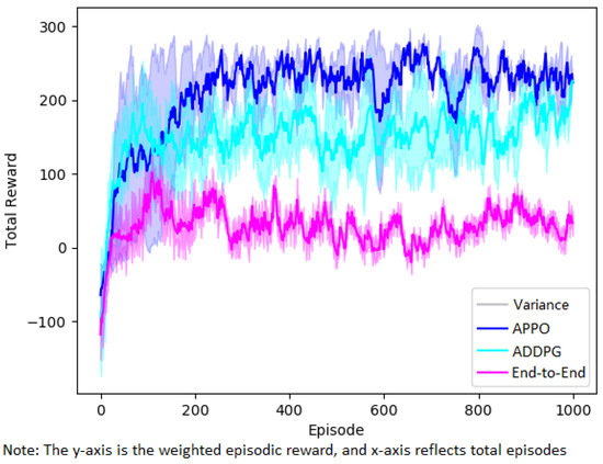 Evaluation result with baseline algorithms. The baselines used for comparison with the APPO method were end-to-end and ADDPG methods. The horizontal axis was the episode, and the vertical axis was the moving averaged total reward.