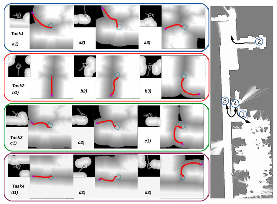 Its first move was spinning right, as shown in Figure 6(a1), and the local target was attracting it to go left. Then, its second move was keeping spinning right with a small step as the agent was almost hitting the side wall (Figure 6(a2)). This time, the local goal was dragging the agent to go up. Later, the agent came to a narrow path, and it was heading straight (Figure 6(a3)). This was because it was in the middle of the obstacle. Similar decisions can be found in other tasks as well. For instance, in task 4, the agent was initialized right in the middle of a corridor. It firstly turned a circle to the right immediately (Figure 6(d1,d2)) and then went past the door entrance, as shown in Figure 6(d3). In Table 2, we summarized the success rate in these four tasks. For all tasks, they have reached more than a success rate, which was a solid improvement compared with the elevator task and the door entrance task in Section 4.2.2.