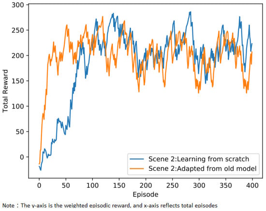 In this section, we initialized a new model with the parameter trained in Section 4.2.3 and applied it to a new scene. The scene was again split into four parts, and each one represented a specific task. As shown in Figure 8, the training process of the model which adapted the old parameters was compared with the model that learned from scratch . Although, in both cases, they converged to a total reward around 200, and the adapted model learned two times quicker. This result can be found by looking at the curve slope in the early stage of training. The adapted model reached the plateau in less than 50 episodes, whereas its competitor reached the same in 100 episodes. Table 4 summarizes the success rate for the four sub-tasks in the new scene. In both cases, they have completed the task with a high success rate (at minimum ).