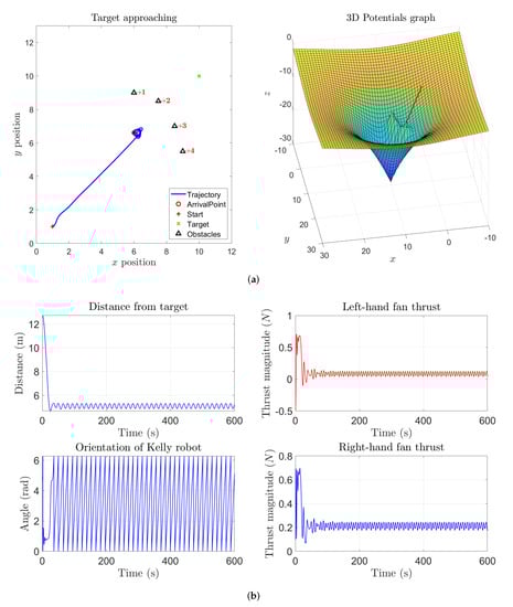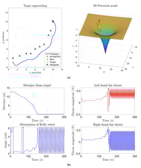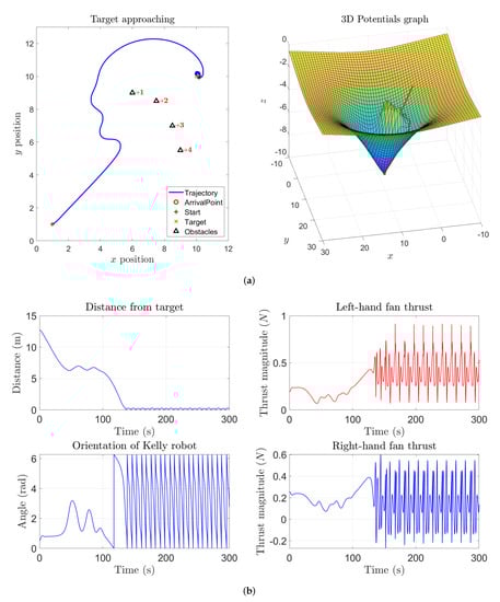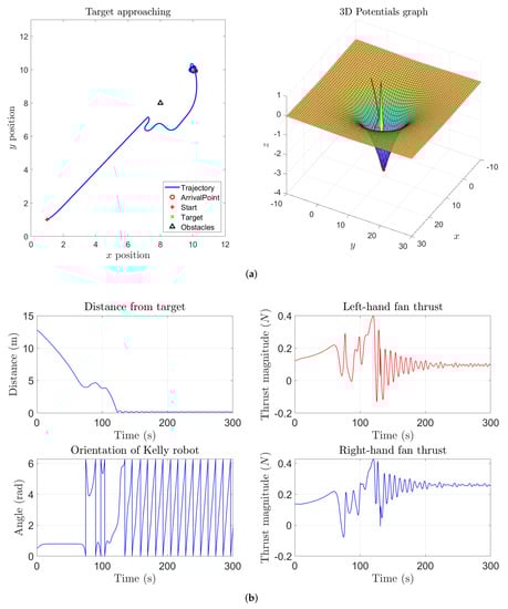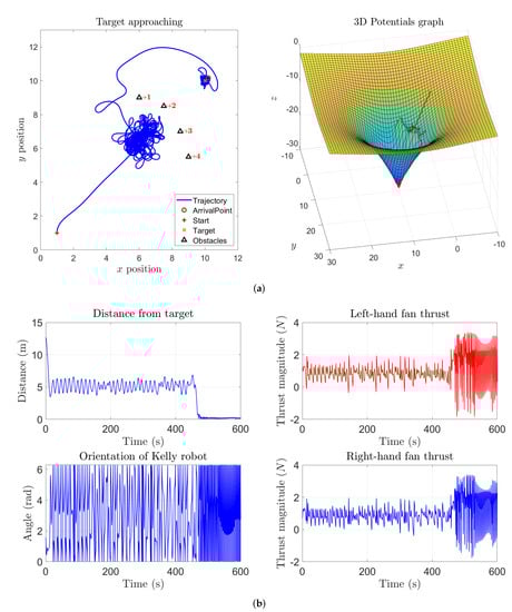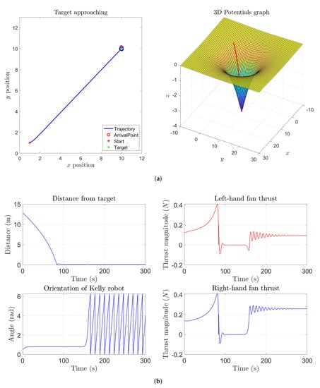 On the basis of the consistent literature accumulated on this subject, the authors of [] proposed a workable feedback control theory, termed VARP (that stands for virtual attractive-repulsive potentials) that they applied to drive a simple robotic platform (named ‘Kelly robot’). The control algorithm developed by the authors Nguyen, Chuang, Tung, Hsieh, Jin, Shi, Marthaler, Bertozzi and Murray was proven effective through experiments conducted at the Caltech University’s multi-vehicle wireless testbed facility. One of the main ideas developed in the paper [] was to endow each element in the environment, including the controlled robot as well as obstacles and targets, by both an attractive and a repulsive potential to improve maneuverability and control flexibility.