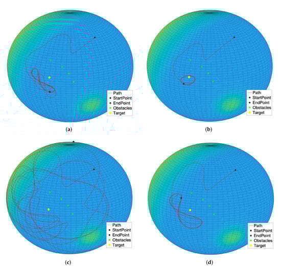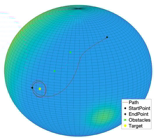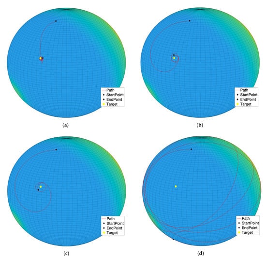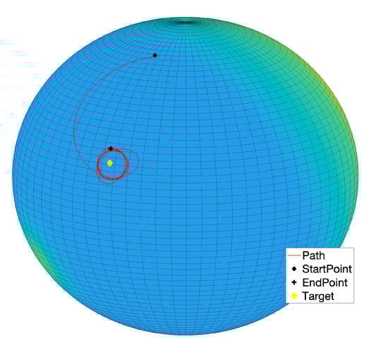 The first five numerical simulation results concern a case study where a single target is present while no obstacles were placed over the sphere. Figure 15a shows the state trajectory followed by an abstract second-order dynamical system on the sphere and, as expected, the system state reaches the prescribed target. Across the following subfigures, the self-propelling coefficient was gradually increased, which explains why the system gradually follows a wider path, as illustrated in Figure 15b,c. With an higher value of the coefficient , self-propulsion is stronger than the attractive influence of the target, hence the system state will wander around the sphere without ever reaching the target, as displayed in Figure 15d. However, by increasing the attractive magnitude of the target (), the attractive potential is able to counteract the self-propelling term in order to make the system state reach the target again, as shown in Figure 16.