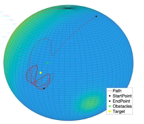 By increasing both the repulsive strength of the obstacles and the self-propelling coefficient, the system will loose control and will start a rapid oscillatory behavior around the barrier and the target, as it can be observed from Figure 20c. It is interesting to notice that, despite the system propulsion induced by the self-propelling term is way stronger than necessary and the system’s state wanders all over the sphere, yet the agent will never hit the barrier. To make the trajectory smoother and bound to the target, it pays to set a higher attractive magnitude for the target in order to counteract the self-propelling term. Such a conclusion may be drawn by observing the simulation result presented in the Figure 20d.
