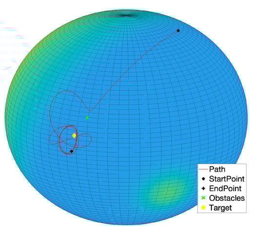 Over the years, potential fields have been applied to constrained attitude control, as they enable to handle simultaneously a large number of forbidden and mandatory zones, while guaranteeing computational tractability and convergence []. Potential fields have also been applied to slew maneuver of satellites; see, e.g., the paper [] that introduced a ‘Sun avoidance potential’. The manuscript [] introduced the notion of exponential repulsive potential whose gradient returns a protection control field to prevent aircraft accidents. The contribution [] utilizes virtual potential functions to generate trajectories to be used as initial guesses for a ‘general pseudospectral optimal control’ algorithm. The research work published in [] presents a real-time hybrid guidance method which fuses the flexibility and robustness of harmonic potential functions with a rapidly-expanding random-tree method; such research outcome allows to plan near-fuel-optimal trajectories on cluttered environments. The paper [] outlines a method based on the theory of virtual potential fields combined with sliding mode control for spacecraft maneuvers in the presence of obstacles; guidance and control algorithms devised in such manner were validated through a six degree-of-freedom omorbital simulator. Guidance algorithms based on artificial potential functions play an increasingly important role in hazard avoidance, although local minima might cause a spacecraft to be unable to reach the desired target landing point in complex terrains. In the paper [], a novel hazard avoidance guidance method was developed by improving the traditional virtual potential function structure.