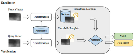A block diagram for a generic cancellable biometric recognition system is shown in Figure 1. The block diagram shown here is general and concise. Almost all the cancellable biometric template protection algorithms can be summarized as follows. The unique and key point of each algorithm lies in the transformation process. It is important that after the transformation, the accuracy of the original biometric recognition can be maintained, and the requirements of the cancellable templates can be achieved.