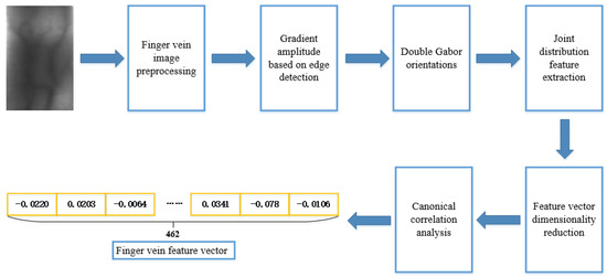 The following steps were used for the finger vein feature vector extraction: (1) Finger vein image preprocessing. Firstly, a Gaussian filter was used to obtain the denoised finger vein image, and then a Sobel operator was used to convolute the image to obtain the gradient components of each pixel in the vertical and horizontal directions; (2) The gradient amplitude was detected based on the edge. Different symbols were given to the gradient amplitude of different edge points to reflect the position difference of different pixels, and the points with the same gradient amplitude but different positions were distinguished in order to effectively improve the discrimination of differential excitation; (3) Using double Gabor direction. The Gabor filter convoluted the finger vein image, extracted the double Gabor direction information, and delimited a direction interval for the finger vein ridge, which is more robust to translation and rotation; (4) Joint distribution feature extraction. The two-dimensional features were constructed by combining the differential excitation diagram with each direction diagram to generate two-dimensional feature vectors; (5) Feature vector dimension reduction. The variance was controlled to respectively reduce the dimensionality of the feature vector in each direction, and each sample generated a feature vector after the dimensionality reduction in two directions; (6) Canonical correlation analysis. The correlation of feature vectors was maximized in two different directions. Finally, DVCG converted a finger vein image into a 462-dimensional feature vector. The specific steps are shown in Figure 2.