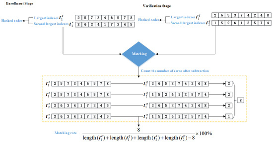 The GRP-DHI hash encoded the largest and second largest values of conversion features into the index representation to achieve the ability to match GRP-DHI hashed codes. The matching score is the total number of conflicts, which can be found by calculating the number of “0” entries (conflicts) over m (the total number of items of hashed code) after subtracting and by element correspondence. Due to the instability of the random matrix, the maximum index changed when two samples with small differences were combined with the random matrix. Therefore, to improve the recognition rate, both the largest and the second largest indexes were introduced (e.g.,, and , ). The specific matching process of hashed codes with the largest indexes and the second largest indexes is shown in Figure 4.