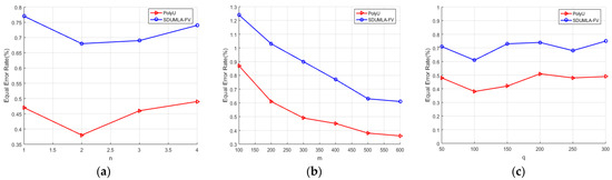 Parameters of GRP-DHI. (a) Equal error rate (EER)(%)-vs.-n. (b) EER(%)-vs.-m. (c) EER(%)-vs.-q.