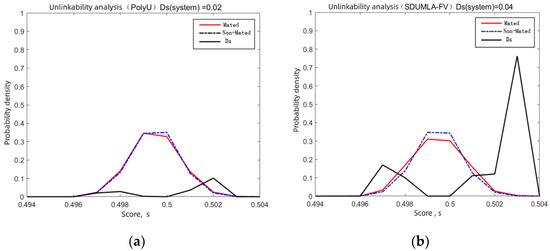 Unlinkability analysis. (a) Unlinkability analysis on PolyU. (b) Unlinkability analysis on SDUMLA-FV.