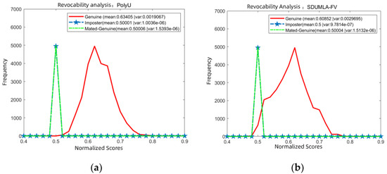 Revocability analysis. (a) Revocability analysis on PolyU. (b) Revocability analysis on SDUMLA-FV.