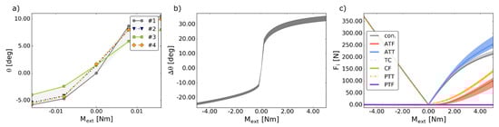 (a) The angular coordinate θ versus the external moment Mext in the considered prestraining approaches; (b) the angular displacement Δθ versus the external moment Mext in the considered prestraining approaches; (c) the values of the forces Fi generated by the ligaments and the contact pairs versus the external moment Mext in the considered prestraining approaches, where: con. is the magnitude of the contact force generated by the two contact pairs. In all figures: the shaded area corresponds to the minima and the maxima of all the considered prestrain cases.