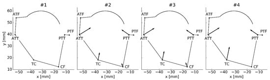 The forces generated by most ligaments were largely unaffected by the prestrain as seen in Figure 2c. Nevertheless, significant relative differences of 38% and 19% were recorded for ATT and ATF, respectively. Again, it is worth noting that in the prestrained cases (#2–#4) a contact force was necessary to stabilize the joint (see Figure 4). This force differed in terms of the magnitude between the cases, nevertheless, its direction remained mostly unchanged.