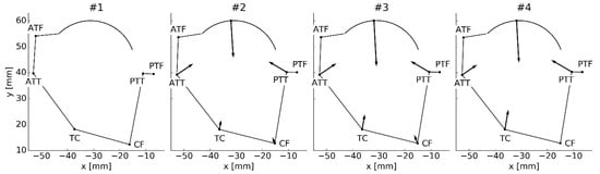 The ligament forces acting on the TCS at the neutral location of the model. The number above the model corresponds to the prestraining approach. The scale of the vectors was adjusted per drawing for clarity and only relevant parts of the TCS’s contour were drawn.