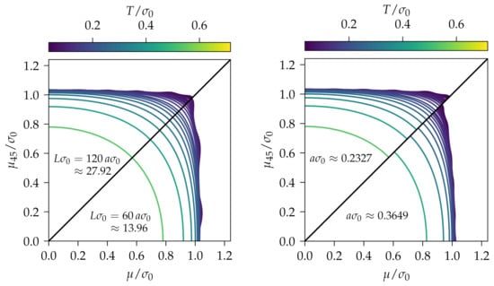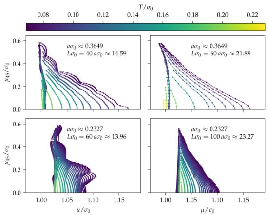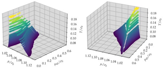 In Figure 6 we show sectional views of the region of instability for the discretization and various temperatures. The upper row corresponds to the larger lattice spacing and the lower row to the smaller lattice spacing, , while the left column corresponds to smaller and the right column to larger spatial extent . From comparing the upper and the lower row, it is obvious that the instability region shrank when the lattice spacing decreased, most prominently in the direction. This is particularly evident in the right column, where the boundaries are significantly less distorted by finite volume effects. In the plots in the left column, however, there are pronounced oscillations that seem to be caused by small spatial volume. These oscillations are reminiscent of those observed in the -T plane in lattice studies of the chirally balanced GN model in and dimensions [31,33,67].
