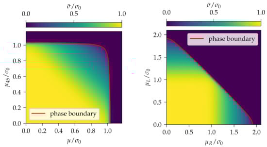 We also studied the behavior of at small temperature , and . is shown as function of and in the left plot of Figure 3 and as function of and in the right plot of Figure 3. To explain these results, we noted that the effective action (21) was the sum of a left-handed part and a right-handed part with chemical potentials and , respectively. At the beginning of Section 4, we had already concluded that , if and . Similarly, we argue now that both parts favor , if and . The numerical results from Figure 3 are consistent with that expectation. In particular, the yellow regions, where , corresponds to and . In the remaining regions of the - plane, or equivalently the - plane, and compete, leading to a continuous transition of the condensate from to . This continuous behavior was consistent with the fact that the lattice GN model with the effective action or equivalently , restricted to a homogeneous condensate, had a second-order phase transition at , and .