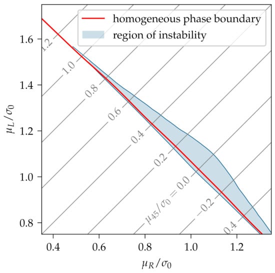 Region of instability and homogeneous phase boundary in the chirally imbalanced -dimensional GN model for the discretization in the - plane for , and . The chiral chemical potential was constant along the diagonal straight lines.