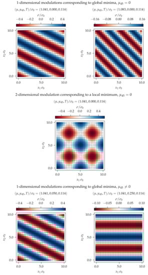 First, we studied the chirally balanced model, i.e., . As an example, the upper left plot in Figure 7 shows a configuration corresponding to one of the global minima of the effective action at . An inhomogeneous condensate was favored, as we learned from the stability analysis discussed in Section 4.2. Even though the minimization algorithm allows arbitrary 2-dimensional modulations, the resulting global minimum was just a plane wave with wave vector . Similarly, the upper-right plot in Figure 7 shows a minimizing condensate at a larger chemical potential . Again, we found a plane wave, but this time with wave vector , i.e., with a smaller wavelength. Even though the found plane waves were 1-dimensional structures, by allowing arbitrary 2-dimensional modulations it reduced finite volume corrections. This was so because, in contrast to our previous work [33], the direction of the wave vector was no longer restricted to being parallel to one of the coordinate axes; thus, its magnitude could be changed in finer steps.