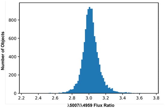 We obtained a list of galaxies with [OIII]4959,5007 emission from Sloan Digital Sky Survey Data Release 8 (SDSS DR8) from the online file galSpecLine-dr8.fits available at https://www.sdss.org/dr12/spectro/galaxy_mpajhu/ (accessed on 25 January 2022). All spectra were flux and wavelength calibrated according to standard prescriptions [25]. Each tabulated galaxy spectrum had been processed through the Max Planck Institute for Astrophysics and the Johns Hopkins University spectroscopic parameters pipeline and had emission-line measurements given in units of erg cm s Å. Unreliable or absent measurements were flagged in the file for easy removal. In all, 22,389 spectra were listed within the redshift range of 0 < z < 0.7, including duplicated spectra. The tabulated emission-line parameters, reasonably accurate for the studies of star formation, stellar mass, and oxygen abundances for which they were intended, were deprecated in favor of a reanalysis by a team from Wisconsin, Portsmouth, and Granada of data from DR12 [26].