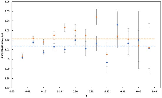 A plot showing the trend of the 5007/4959 ratio () with redshift as found from the first (orange dots) and second (blue dots) analyses. Data for the plots are given in Table 1. The dashed orange line shows the bin-wise mean value of the first analysis while the dotted blue line shows the same for the second analysis.