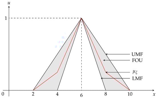 The secondary membership function, in Definition 9, of an IT2-FV is identical to 1, such that the uncertainty—that is, the information which the third dimension of the IT2-FV describes—of the membership function can be omitted. Therefore, the IT2-FV can be expressed by the deterministic FOU or its upper and lower membership functions.