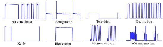 The operating load model was used for pretraining in this article [28,29,30]. A typical energy meter was selected to record the characteristics of electrical devices. The active power, reactive power, current, and voltage measured by the energy meter were recorded in the memory of the microcontroller with a sampling rate of 1 Hz. The signatures of the devices are shown in Figure 2.