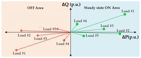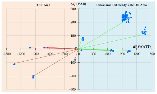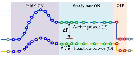 Normally, the switch-on power of the electrical appliances fluctuates, while a certain value is given when they are switched off, as shown in Figure 3. The on and off active and reactive power levels of the electrical appliances are symmetrical, as shown in Figure 4. The symmetrical characteristics can be used to determine the operating power as information for grouping electrical appliances.