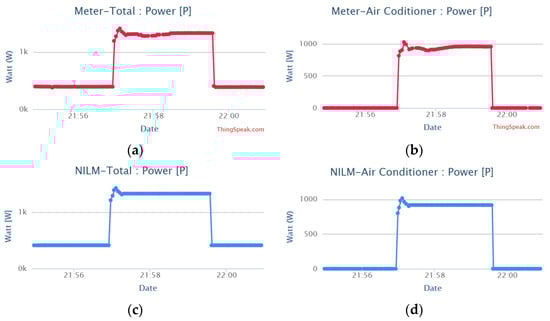 Comparison of the active power of the air conditioner between direct measurements and estimation by NILM. (a) Total active power measured by the main meter; (b) Active power of the air conditioner measured by the meter connected directly to the appliance; (c) Total active power from the power of all electrical appliances broken down by the NILM; (d) Active power of the air conditioner broken down by the NILM.