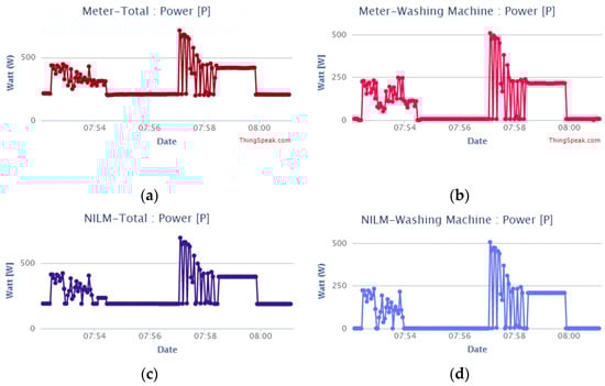 Comparison of the active power of the washing machine between direct measurements and estimation by NILM. (a) Total active power measured by the main meter; (b) Active power of the washing machine measured by the meter connected directly to the appliance; (c) Total active power from the power of all electrical appliances broken down by the NILM; (d) Active power of the washing machine broken down by the NILM.
