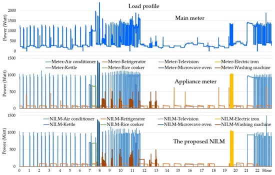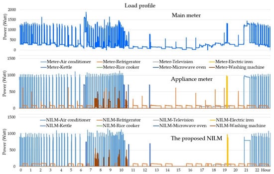 Figure 16 and Figure 17 show that the hourly electricity consumption estimated by the NILM method is similar to that from direct meter measurements in terms of both energy consumption and duration. An assessment was made based on the Confusion Matrix method according to Equations (5)–(8); the system tested had 5860 changes in electrical appliance performance, among which the proposed method detected 5398 changes in the timing of the data.