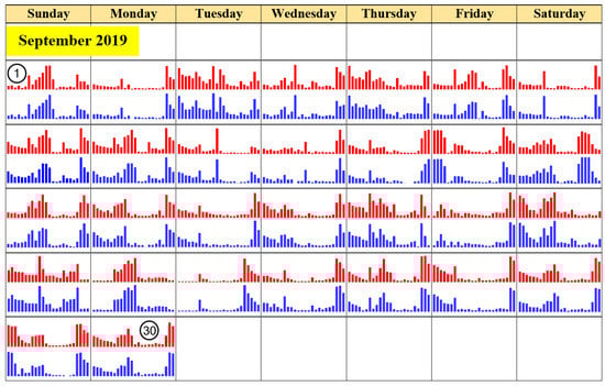 Figure 14 and Figure 15 show the total and appliance power from the meter and appliance power from NILM from example data for 15–16 September 2019. Figure 16 and Figure 17 show the hourly total energy consumption and air conditioner energy consumption during September measured by the meter and estimated from the proposed NILM.