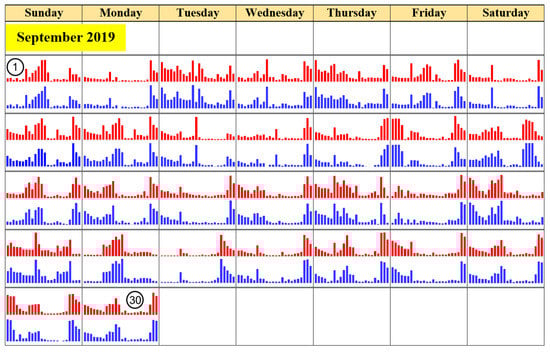 The results of the validity assessment of the energy consumption values, according to Equations (2) and (3), are shown in Table 4 and Figure 19, showing a graph comparing the cumulative energy consumption in each hour of the day of electrical appliances in September from direct measurements and the proposed NILM estimates, with similar results. For the evaluation results per device, the air conditioner has the highest accuracy score of 0.96, while the TV has the worst evaluation result because it has low power consumption and a low F1-score. Another interesting device is the washing machine, which attained an F1-score as high as 0.97 but a power accuracy score of 0.86 because of the washing machine’s motor spinning back and forth, making the estimated power less than the active power consumption from direct measurement with the meter. This result in Figure 20 shows that the difference in total electrical energy consumption for the whole month was 9.5 kWh or 6.10%.