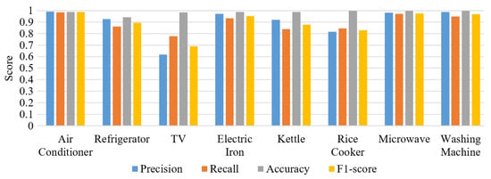 The evaluation results shown in Table 3 and Figure 18 have an average accuracy F1-score of 0.90. The device with the lowest F1-score was the television as it was similar to other devices that were not among the electrical appliances considered, such as a fan, etc., followed by the rice cooker, because it changes an average of twice a day and looks like a kettle; therefore, there is a chance of error in distinguishing these devices, but most devices could be distinguished with a very good rating.