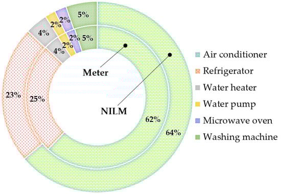 Proportions of energy consumed by electrical appliances as measured by meter readings and estimated from NILM.