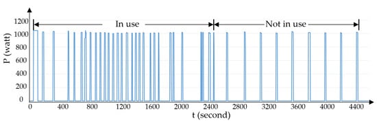 When the iron is plugged in and turned on, but not in use, it stays hot all the time and consumes energy. Figure 25 shows a comparison of the active power when the electric iron is in use and when it is not in use. When the electric iron is not in use, it is turned off for a longer time and turned on for a shorter time, about 8 times per 20 min, and the duty cycle is symmetrical, while when the electric iron is in use it is turned on more than 16 times per 20 min. The number of times the electric iron is turned on and off per interval can be used to help decide whether to send a warning message to the homeowner.