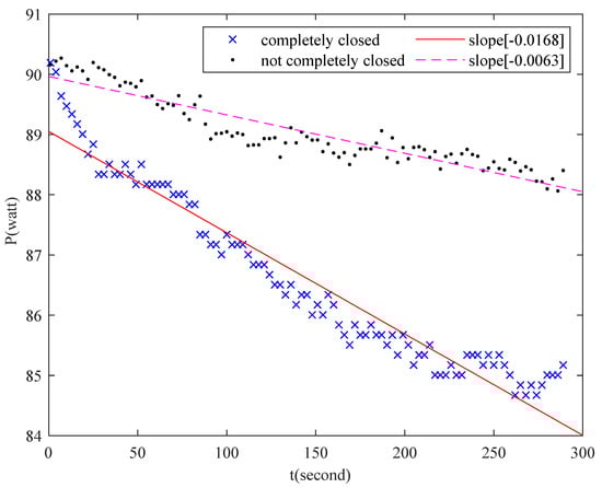 If the refrigerator door is not fully closed, the system can be checked by the actual power drop rate, which is lower than that when the door is fully closed. As shown in Figure 26, the active power drop rate is −0.0063 watt/second when the refrigerator door is not fully closed, while the active power drop rate is −0.0168 watt/second when the refrigerator door is closed. The embedded NILM system can relay this information to the homeowner by sending a message through the LINE notify application installed in the microcontroller.